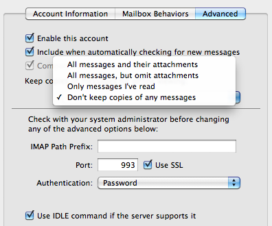 Even after deleting the folder, Mail recreated it and continued downloading the message from Gmail. To solve the situation, I opened the Mail Preferences (Command + , ) and chose both my GMAIL accounts, I clicked on the Advanced tab and changed the “Keep a Copy for Offline viewing” setting below: