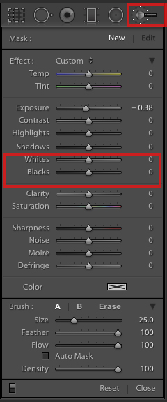 Whites and Blacks sliders have been added to the adjustment brush, graduated filter and radial filter. Use these to fine tune the brightest and darkest tones in local areas of your photos.