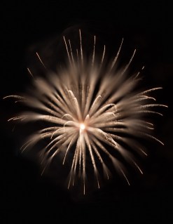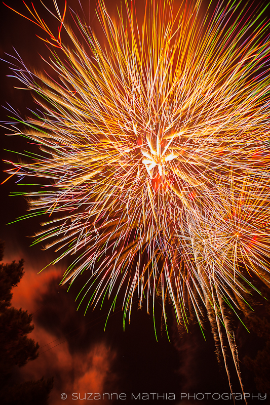 All set up and ready to go…take some test shots of the first fireworks. Open the shutter at the first burst. Hold it open several seconds, until that burst is finished.  See how it looks.  Try different lengths of time and find the speed that you like best. Then hold it open longer and allow several bursts to appear in one shot. Leaving the shutter open for multiple bursts makes it look like they all went off at the same time and can look spectacular.  However, there’s a limit, leaving the shutter open for too long and too many bursts may end up in overexposed areas and too much confusion so strike a happy medium.