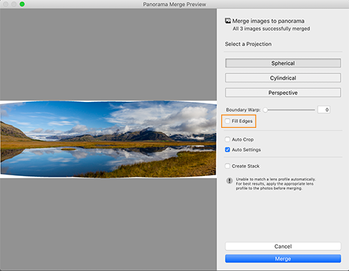 Often, when you merge your photos to create a panorama, the result is an image with a lot of uneven edges. Fill Edges is an option that uses Content-Aware Fill technology to fill the uneven edges of your panorama automatically.