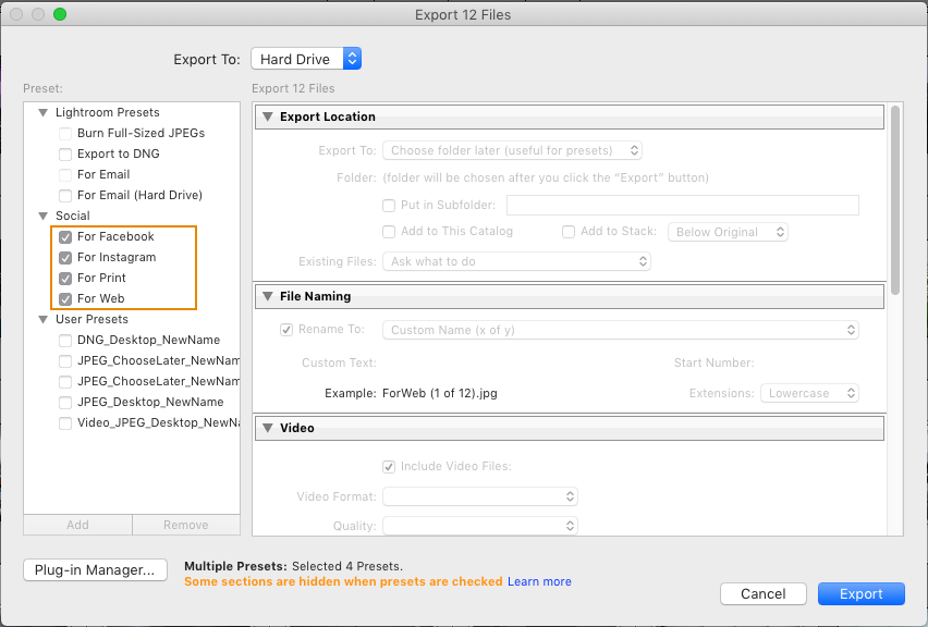 You can now perform multiple export jobs for the same set of images all at once. Lightroom Classic will export one image for every preset selected.