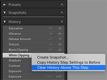 - Right-click (Win) or Control-click (macOS) the selected step and select Clear History Above This Step.