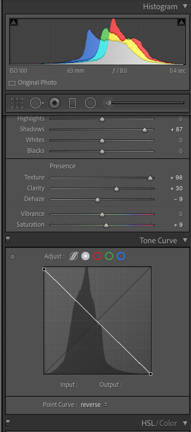 Select the Point Curve and Grab the end points on the curve Grab the left one on the bottom and drag it to the top. When you have the tone curve inverted-immediately make a Develop Preset, then it will always be just one click on the preset needed.